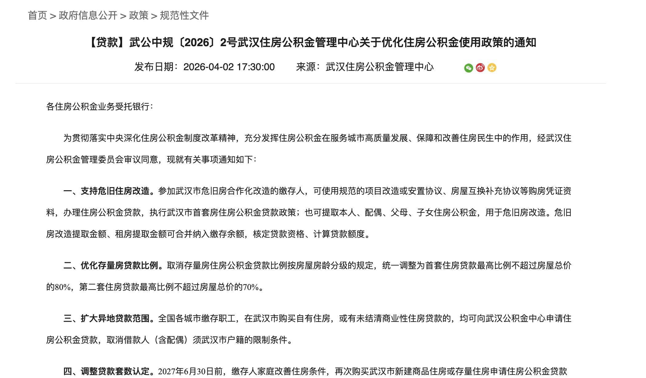 湖北日报讯(记者杨文漪)4月3日,湖北日报全媒记者从武汉住房公积金管理中心获悉,武汉市对住房公积金使用政策进行优化调整。此次调整涉及支持危旧房合作化改造、优化存量房贷款比例、扩大异地贷款范围及调整贷款套数认定等多项内容,新政策自4月2日17时30分起正式施行。